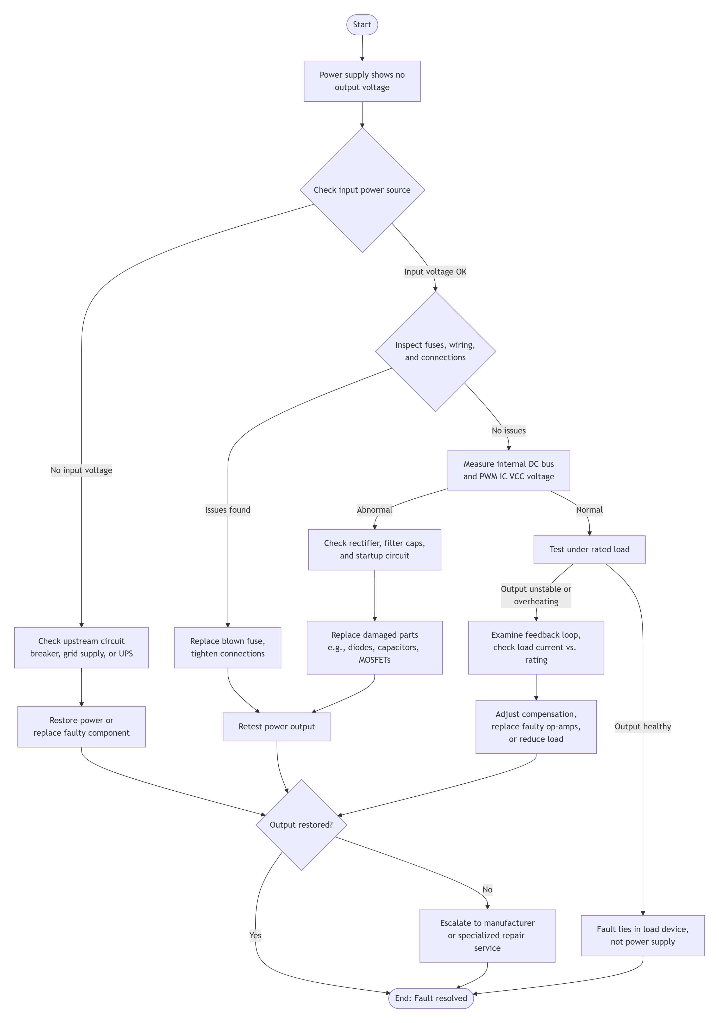 Power troubleshooting is a process that combines logical reasoning with patient measurement. By following the principle of 'from outside to inside, from input to output, from simple to complex' and using a flowchart as a guide, most common faults can be located. When repair conditions are not available, replacing the entire power module or seeking professional help is a safer and more reliable option.